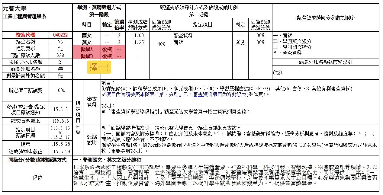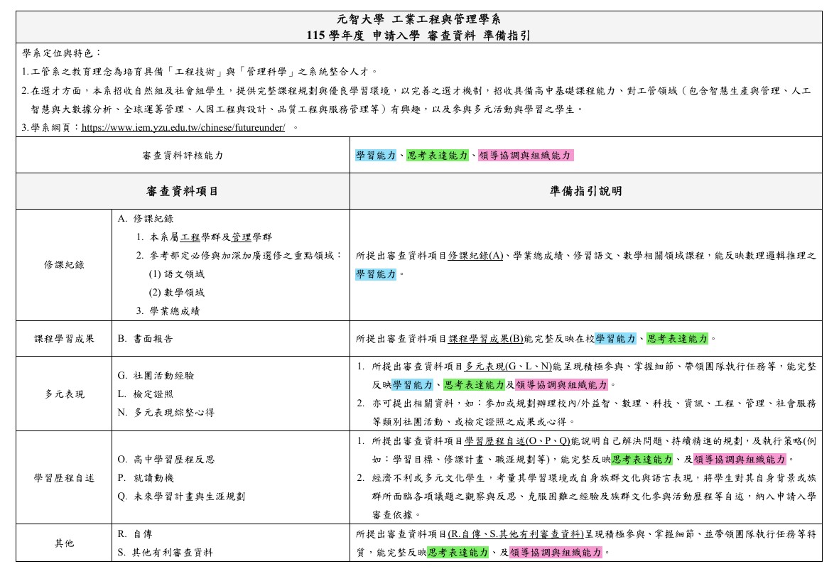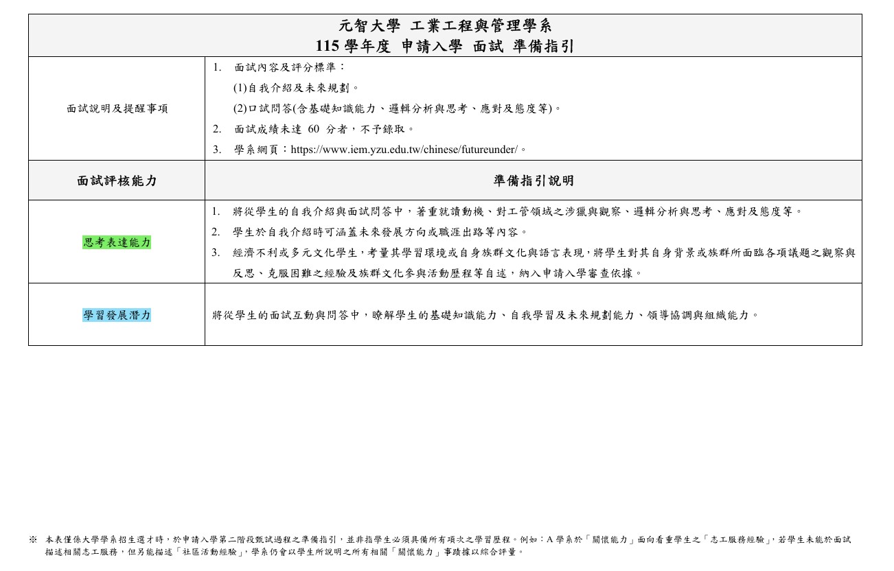 115元智工管系申請入學(校系分則、資料審查/面試學習準備指引)