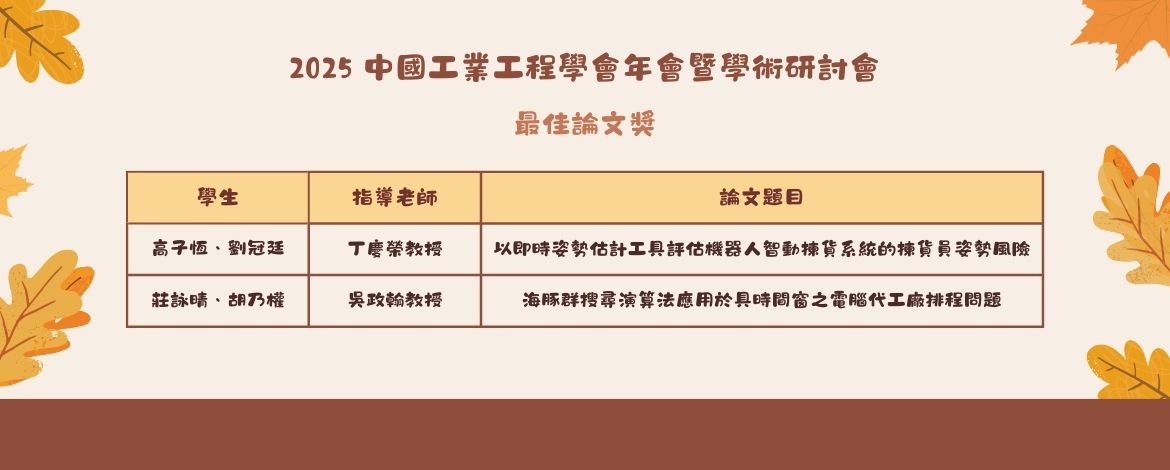 恭賀~~本系丁慶榮老師及吳政翰老師指導學生 榮獲 2025中國工業工程學會年會暨學術研討會「最佳論文獎」~~