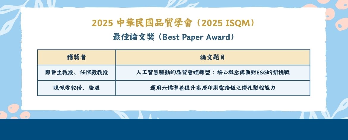 恭賀~~本系鄭春生老師和任恒毅老師,以及陳佩雯老師帶領駱威參加中華民國品質學會 2025 ISQM 榮獲「最佳論文獎」殊榮~~