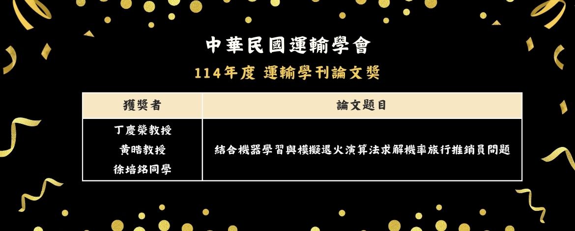 恭賀~~本系丁慶榮老師和黃晧老師帶領徐培銘參加中華民國運輸學會榮獲114年度「運輸學刊論文獎